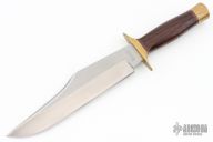 This Bowie by Robert Rippy features a satin finished blade with a false top edge and textured flats, .265" blade stock and 1.886" blade depth, hidden tang construction. The handle has a brass guard and butt, cocobolo grip with browhn spacers . Excellent condition.