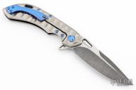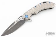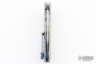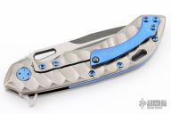 This Wayfarer 247 from Olamic Cutlery features a two-tone finished spear point blade, thumbhole, notched thumbrest and flipper. The handle is orange peel finish sculpted titanium with an anodizeed finished titanium pocket clip is positioned for tip up carry with a ceramic ball inlay, floating titanium backspacer.  The Wayfarer 247 is very comfortable in the hand and flips well with no wrist action needed. Blade is centered when closed and locks up with no play.  Excellent Condition.