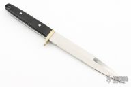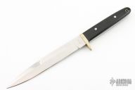 This Slim Spearpoint by Robert Rippy features a satin finished blade with false top edge, .188" blade stock and .957" blade depth, full tang construction. The handle has a nickel silver guard with black paper micarta scales. Excellent condition.