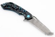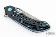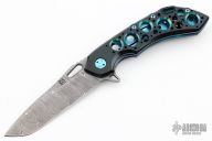 This Wayfarer 247 from Olamic Cutlery features a Damascus clip point blade with swedge, thumb hole, notched thumb rest and flipper. The titanium handle scales are titanium with matching pocket clip is positioned for tip up carry, matching floating polished anodized titanium backspacer. The Wayfarer 247 is very comfortable in the hand and flips well with no wrist action needed. Blade is centered when closed and locks up with no play.  Limited edition 18/25.  Excellent condition.