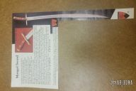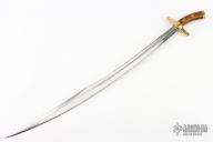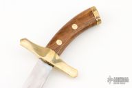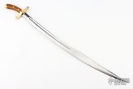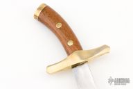 This Falchion features a satin finished blade with unsharpened edges and fullers, .276" blade stock and 1.566" blade depth, hidden tang construction. The handle has a brass guard and butt with a wood grip. Has some scratches and patina, otherwise good condition.