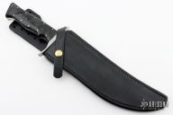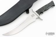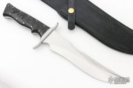 This Model 5 by Walter Brend features a two tone recurve blade with mirror polished grinds and satin finished flats, sharpened top edge, .248" blade stock and 1.822" blade depth, full tang construction. The handle has a titanium guard with black canvas micarta scales. Comes with a black leather sheath made by Chattanooga Leatherworks. New from maker!