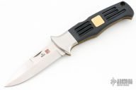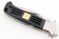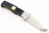 This AL MAR SERE Model 3003 Tactical Folding Knife features a satin finished spear point blade with false top edge. The handle has stainless steel bolsters, textured black Neoprene with the RARE and limited GOLD Al Mar Chop inlaid on both sides, brass liners, stainless steel spring and backspacer, lanyard hole. Comes with a black leather sheath. Excellent condition.