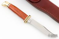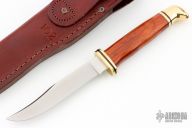This Buck 102 custom by Buck Knives features a satin finished blade with .122" blade stock and .676" blade depth, hidden tang construction. The handle has a brass guard and butt, dymondwood grip. Includes original box and brown leather sheath. Excellent condition.