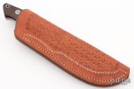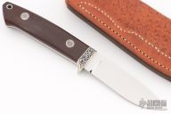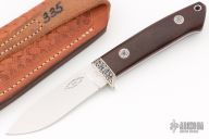 The classic Drop Point Hunter that made Bob Loveless designs so famous. Mirror finished drop point blade with the "R.W. Loveless maker Riverside, Calif." logo. Full tapered tang construction. .194" Blade Stock .953" Blade Depth. The handle has a stainless steel guard and brown canvas micarta scales with red liners, lanyard hole. #335. The guard and pins have been engraved with gold inlays. Comes with matching numbered leather sheath. Has a few very light scratches, otherwise excellent condition.