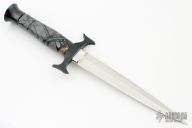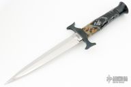 This dagger by John Young features a double edged mirror polished blade with .288" blade stock and 1.039" blade depth, hidden tang construction. The handle has plum brown steel guard and butt with a Picasso Marble grip. Comes with a zippered case. Excellent condition.
