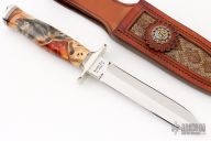 This Dagger by Randy Lee features a mirror polished double edged blade with .260" blade stock and 1.080" blade depth, hidden tang construction. The handle has a nickel silver guard and butt, stabilized California Buckeye Burl and russett resin grip with a spacer pattern consisting of black and nickel silver. Comes with a hand tooled brown leather sheath with snake skin inlay. Excellent condition. Comes with a zippered case and COA.