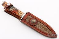 Randy’s fascination with knives began as a young man when he made his first knife in a high school “metals” class. He collected them for years and eventually began making his own to get a better edge-holding skinner for hunting. Randy read books and visited local makers to learn the craft. In 1979, he decided to invest in shop equipment so that he could properly master his knife making skills. In a few years, he was making and selling knives to local hunters, while continually developing his style and craftsmanship. He attended his first knife show in 1986 and has been participating in about six shows each year since then. As an avid hunter, Randy knows how a good hunting knife should perform. He loves to “field-test” his designs and feels that a quality knife should not only look great, but perform well as a tool. He offers a wide variety of knife styles; from utility hunters and fighters to collector pieces such as daggers and bowies. Although the actual work of grinding and buffing knives is very tedious, he always finds it rewarding to see the final finished product. Randy particularly enjoys meeting people who find knives as interesting and exciting as he does. Randy’s wife, Sonja Lee, is one of the premier sheath makers in the business. Using exotic hides, or leather and various forms of tooling, she has mastered the craft of sheath making. Sonja creates the custom sheaths which are provided for each of Randy Lee’s knives and she is now making custom sheaths for many other knife makers and collectors.