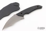 This Karambit style knife features a swedged hawkbill blade composed of titanium, with notched thumbramp, .121" bladestock and 1.39" blade depth. Has g10 scales. Comes with a kydex sheath. Has some light scuffs and scratches, great condition otherwise.