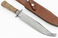 This Inferno Bowie by Master Smith Jerry Lairson Sr features a Damascus blade with sharpened top edge, the blade has an acid etched flame motif, .209" blade stock and 1.698" blade depth, hidden tang construction. The handle has a Damascus guard and fluted spacer, curly maple grip with silver wire inlays. Comes with a brown leather sheath and a zippered case. Excellent condition. This knife wears his Master Smith stamp. Comes with a COA.