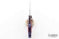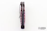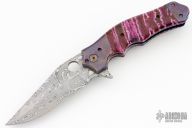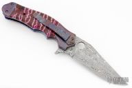This Triumph by Crawford Knives features a Damasteel blade with false top edge, fileworked thumbrest and flipper. The handle has dovetailed MokuTi bolsters front and rear , and mammoth tooth scales with red liners, anodized and fileworked titanium liners with jeweled interiors, fileworked tip down MokuTi clip, fileworked anodized titanium backspacer. Smooth action. Nice lockup and blade seating. Great looking materials. Excellent condition. Comes with a zippered case.