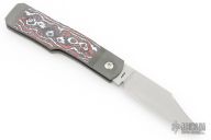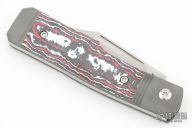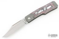 This Sharpshooter Jack is a gunstock slipjoint model by Jack Wolf Knives featuring a hand satin finished clip point blade with longpull. The handle has integral bead blast finish pinched and fluted titanium front and rear bolsters and liners, carbon fiber scales with a stainless spring. Comes with box, metallic tube with J. Gonzo artwork, leather slip, sticker and microfiber cleaning cloth. New from Maker.