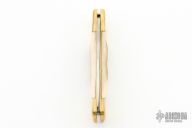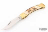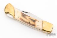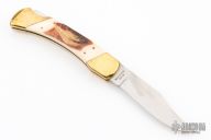 This lockback by Parker-Imai features a satin finished blade with nail nick. The handle has a brass frame with stag jigged bone scales, stainless steel backspacer. Comes with original box and nylon sheath. Excellent condition.
