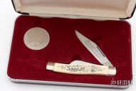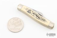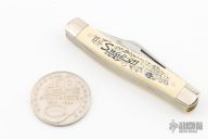 This slipjoint by Snap-On was made for their 60th Anniversary and is #8125 of 20,000. It has satin finished blades with nail nicks. The handle has nickel silver bolsters, white composite covers, brass liners, stainless steel springs. Comes with original box and coin. Excellent condition.