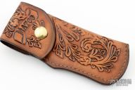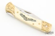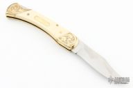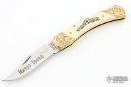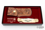 This lockback by Schrade is a Matco Tools Special Edition from 1983. It features a satin finished clip point blade with nail nick. The handle has a engraved brass frame with white composite inlays with brass escutcheon. Comes with a hand tooled brown leather sheath and original box.  Excellent condition.