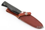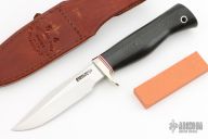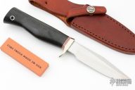 This Model 5-4 Camp and Trail by Randall Made Knives features a clip point satin finished blade with false top edge and notched thumbrest, .165" blade stock, .954" blade depth, hidden tang construction. The handle has a nickel silver guard and a black linen micarta grip with red/white/blue spacers. Includes a brown leather sheath, sharpening stone and a Randall zippered case. Excellent condition.