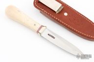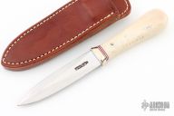 This Model 24 Guardian by Randall Made Knives features a satin finished double-edged blade with notched finger rests, .111" blade stock and .869" blade depth, hidden tang construction. Fossil walrus ivory grip with red/white/blue spacers and a nickel silver guard. Both edges of the blade are sharpened with 1" of thumb notches. This model was designed in 1978 for use by police, undercover agents and law enforcement personnel for self-protection and as a back-up weapon. Comes with a brown leather sheath w/ boot clip and a zippered case. Excellent condition.