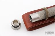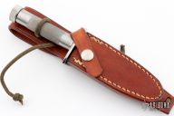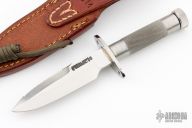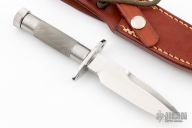 The Model 18 Mini by Randall Made Knives, features a satin finished blade with sawteeth, stainless steel fittings, and stainless steel handle with knurling. Approximately 300 made. .166" Blade Stock .885" Blade Depth. Includes screw on butt cap for survival item storage. Comes with original leather sheath and a zippered case. Has a few light scratches, otherwise excellent condition.
