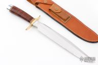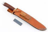 "The Model 1 by Randall Made Knives was made famous by Allied combat troops in World War II and has since been widely used in all theaters of war." This knife features an 11" satin finished blade with a sharpened top edge, .228" blade stock and 1.578" blade depth, hidden tang construction. Brass guard, stacked leather handle with red/white/blue spacers, and a duralumin butt cap. Includes a brown button brown leather sheath made by Bob Stackman, who made special order sheaths for Randall. Has some light painta and scratches, otherwise excellent condition for this 70 year old knife. Comes with a Randall zippered case.