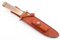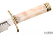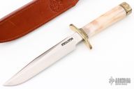 This Model 1-7 from Randall Made Knives features a satin finished clip point blade with sharpened top edge, .234" blade stock and 1.181" blade depth, hidden tang construction. The handle has an engraved brass guard and butt done by Ron Skaggs, black/brass spacers, and a fossil walrus ivory grip. Comes with brown leather sheath and a Randall zippered case. Excellent condition.