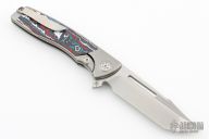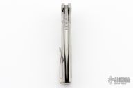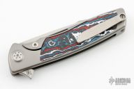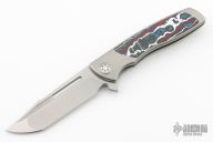This Mini EVO Flipper from Brian Nadeau features a hand rub satin finished blade with a fullers, thumbhole, flipper and notched thumbrest. The handle is comprised of a bead blasted titanium frame with Nebula Fat Carbon inlays, satin titanium tip up clip. Rides on bearings, nice detent, lockup and blade seating, stainless lockface insert. Comes with original box. Excellent condition.