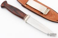 This Special Model 24 Guardian by Randall Made Knives is #001 and the Prototype. It features a satin finished double-edged blade with notched finger rests, .126" blade stock and .880" blade depth, hidden tang construction. Laminated Rosewood grip with red/white/blue spacers and a nickel silver guard. Both edges of the blade are sharpened with 1" of thumb notches. This model was designed in 1978 for use by police, undercover agents and law enforcement personnel for self-protection and as a back-up weapon. Comes with a brown leather sheath w/ boot clip and a Randall zippered case. Excellent condition. Made in the late 70s.