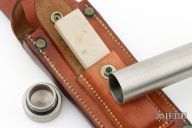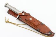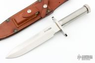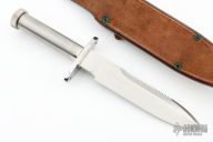 This Model 18-7.5 Attack Survival from Randall Made Knives has a spear point blade with sharpened top edge and sawteeth, .223" blade stock and 1.454" blade depth, hidden tang construction. The handle has a stainless steel guard and butt cap, smooth stainless steel handle. Comes with a brown roughback leather sheath and a Randall zippered case. Excellent condition.
