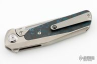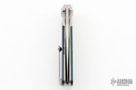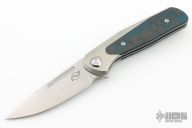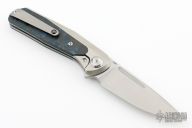 This GSD, by Liong Mah, features a satin finished blade with a notched thumbrest and flipper. The handle is composed of a orange peel finished titanium frame with fat carbon scales and a titanium tip up pocket clip.  Nice detent, lockup and blade seating. Includes a padded case.  Excellent condition.