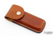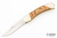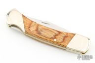 This knife by Bear MGC features a satin finished clip point blade with nail nick. The handle has nickel silver bolsters, front and rear, dymondwood scales and brass liners. Comes with brown leather sheath. Excellent condition.