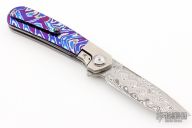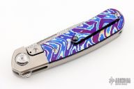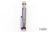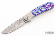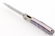 This L1 is a Liong Mah design executed by Reate Knives. It features a Damasteel blade with notched thumbrest, fullers and flipper. The handle has a blasted integral ti bolsters, Mokuti inlays with a matching tip up clip. Comes with original case and card. Excellent condition.