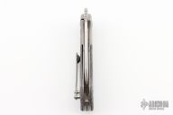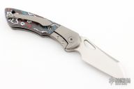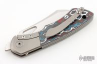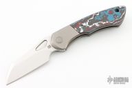 This Whippersnapper Bolsterlock from Olamic Cutlery features a satin finished blade, thumbhole, notched thumbrest and front flipper. The titanium frame is bead blasted and has Fat Carbon Nebula scales, pocket clip is positioned for tip up carry, floating bead blast finished titanium backspacer. Blade is centered when closed and locks up with no play. Comes with maker's card with a serial number of 034-W and dated 07/21/2022. Includes a padded zippered case. Excellent condition.