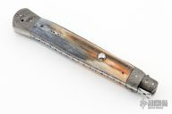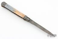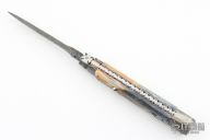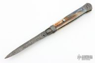 This Picklock by Burn Knives features a Stainless Damascus dagger blade with false top edge and fileworked spine, .172" stock. The handle has Damascus bolsters, front and rear, giraffe bone scales, fileworked stainless steel backspacer and anodized fileworked titanium liners. Excellent condition. Nice lockup, blade seating and action.