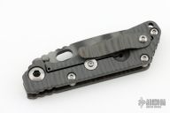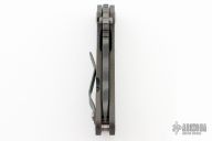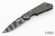 This JVA by Mick Strider is larger than a PT, but smaller than an SNG. It features a tiger striped blade with notched thumbrest and thumbhole. The handle has a flame finished titanium frame with matching tip up clip. New from Maker at the 2023 CCKS.