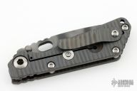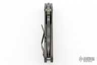 This JVA by Mick Strider is larger than a PT, but smaller than an SNG. It features a tiger striped blade with notched thumbrest and thumbhole. The handle has a flame finished titanium frame with matching tip up clip. New from Maker at the 2023 CCKS.