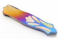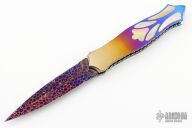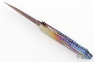 This "Rocket" linerlock dagger by Leonardo Frizzi features a blued Dragonskin Damascus blade with sharpened top edge and notched thumbrest. The handle has anodized titanium scales with textured edges and black lip pearl inlays, fileworked stainless steel liners, fileworked and anodized titanium backspacer. Nice detent, lockup and blade seating. Comes with a zippered case. Excellent condition.