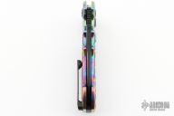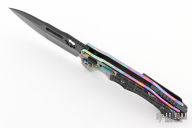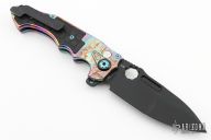 This Pitboss 2 by Andre De Villiers features a black blade with thumbhole, notched thumbrest and flipper. It swings smoothly on a ball-bearing system and has both a thumb hole and flipper opener; it can also be opened or closed with a flick of the wrist when the inlaid button lock is held down. A safety switch on the side allows the blade to be locked in the closed position or provides an additional level of safety in the open position. It has an anodized titanium frame with black G-10 inlays. A jimped, titanium backstrap with a lanyard hole and a tip-up, titanium pocket clip with hidden screws. "2022" on the ricasso. Comes with original case. Excellent condition.