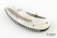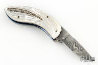 This Art Knife by the Legendary Kenneth King features a Damascus blade with fileworked spine and gold thumbstud. The handle has beautifully carved mother of pearl scales with 13 diamonds on each side set into sterling silver, anodized titanium liners, fileworked stainless steel backspacer with "KEN KING" engraved on the inside of the backspacer along with "A-E 1-5 HC". Nice detent and lockup. Excellent condition.