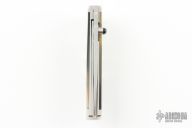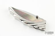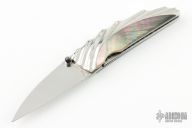 This linerlock folder from Koji Hara features a mirror polished drop point blade with black lip pearl thumbstud. The handle has mirror polished and fluted nickel silver scales with black lip pearl over stainless liner and backspacer. Nice detent, lockup and blade seating. Excellent condition. Comes with a zippered case.