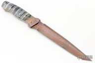 This Fighter by Reese Weiland features a colored Damascus blade with false top edge, .173" blade stock and 1.358" blade depth, full tang construction. The handle has matching Damascus bolsters and mammoth tooth scales with red liners. Excellent condition.