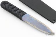 This Dagger by Warren Thomas features a chisel ground finger print anodized titanium blade with carbon fiber laminate and a carbidized edge, .251" blade stock and 1.095" blade depth. The handle is comprised of a Japanese style wrap over stingray skin. Includes kydex sheath. Excellent condition.