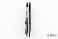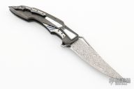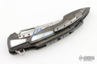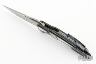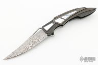 This Curv Flipper by Ron Best features a Damasteel blade with flipper. The handle has a carbon fiber frame with mother of pearl inlays, anodized titanium backspacer, tip up zirconium clip, zirconium pivot collars, anodized titanium hardware. Rides on bearings, nice detent, lockup and blade seating. "Ronald Best 157 Prototype" inside the frame. Comes with original box. Excellent condition.