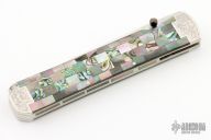 This linerlock folder by Koji Hara features a mirror polished blade, stippled stainless steel double bolsters, and a tiled handle of alternating mother of pearl, abalone, and black lip pearl. Pearl inlays in backspacer. Beautiful work with great attention to detail. The soft case is made from the fabric of a Japanese obi. Nice detent, lockup and blade seating. Excellent condition.