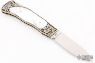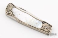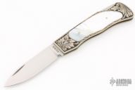 This lockback folder by Jess Horn features a hand rub satin finished blade with nail nick. The handle has an engraved nickel silver frame with mother-of-pearl inlays and stainless steel backspacer. Engraved by "CKM" which is Kimberly Cover. Comes with a zippered case. Excellent condition. #005 on ricasso.