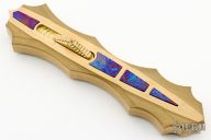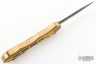 This Burn Custom Vengeance OTF has a Damascus hollow ground double edged blade. The chassis is cut from premium brass with a two-tone bead blast and satin finishes, has mokuti inlays. Blade deploys with authority and locks up tight with minimal blade play. Has a couple light scratches and patina, otherwise excellent condition. Comes with a zippered case.
