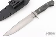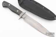 This Bowie by Journeyman Smith Craig Camerer features a hand rub satin finished blade with false top edge, nice hamon, .200" blade stock and 1.320" blade depth, hidden/mortise tang construction. The handle has a bead blasted stainless steel guard, black canvas micarta grip. It comes with a kydex sheath with a belt clip. Has a few light scratches, otherwise excellent condition.