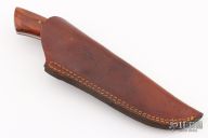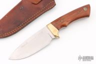 This heavy duty hunter/skinner by Muela features a satin finished blade with a full tapered tang construction, .177" blade stock and 1.709" blade depth. The handle has brass bolsters and stabilized beech wood scales. Comes with leather sheath. Has some scratches, has been resharpened, otherwise good condition. 1980s