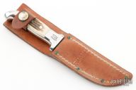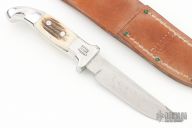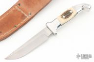 This Sticker by Ruana features a satin finished blade with false top edge, .120" blade stock and .858" blade depth, hidden tang construction. The handle is cast from aluminum with elk horn inserts. Comes with brown leather sheath. Has some patina spots on the blade, otherwise good condition.