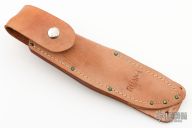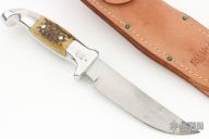 This Sticker by Rudy Ruana features a satin finished blade with false top edge, .179" blade stock and 1.052" blade depth, hidden tang construction. The handle is cast from aluminum with elk inserts, guard has "M" stamp which signifies it was made by Rudy Ruana. Comes with brown leather sheath. Has some light patina and scratches, otherwise good condition.