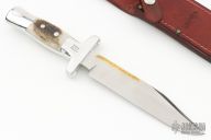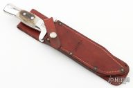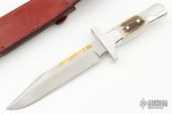 This 29A Junior Bowie by Rudy Ruana features a satin finished blade with a sharpened top edge and hammered brass parry guard, .248" blade stock and 1.208" blade depth, hidden tang construction. The handle is cast from aluminum with elk inserts. Comes with brown leather sheath. Has a couple light scratches and patina, otherwise excellent condition.