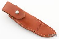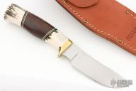 This Skinner by Rudy Ruana features an upswept blade with false top edge with notched thumbrest, .166" blade stock and 1.155" blade depth, hidden tang construction. The handle has a brass guard and a stag and ironwood grip with black/brass/white spacers. Comes with original brown leather sheath. Has some light patina, otherwise good condition.